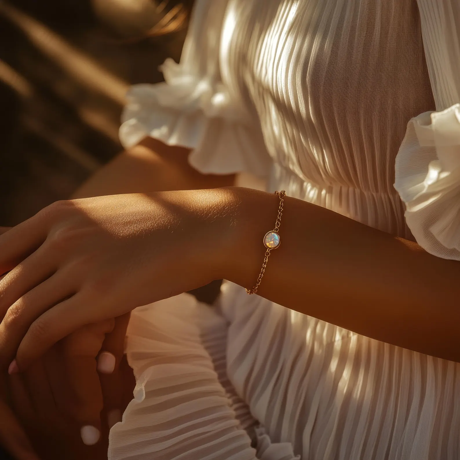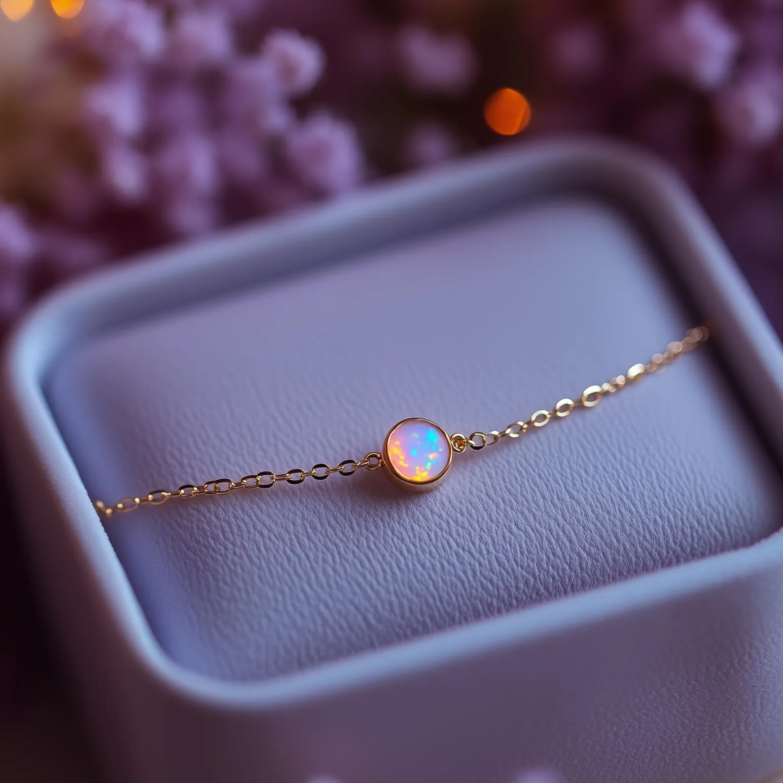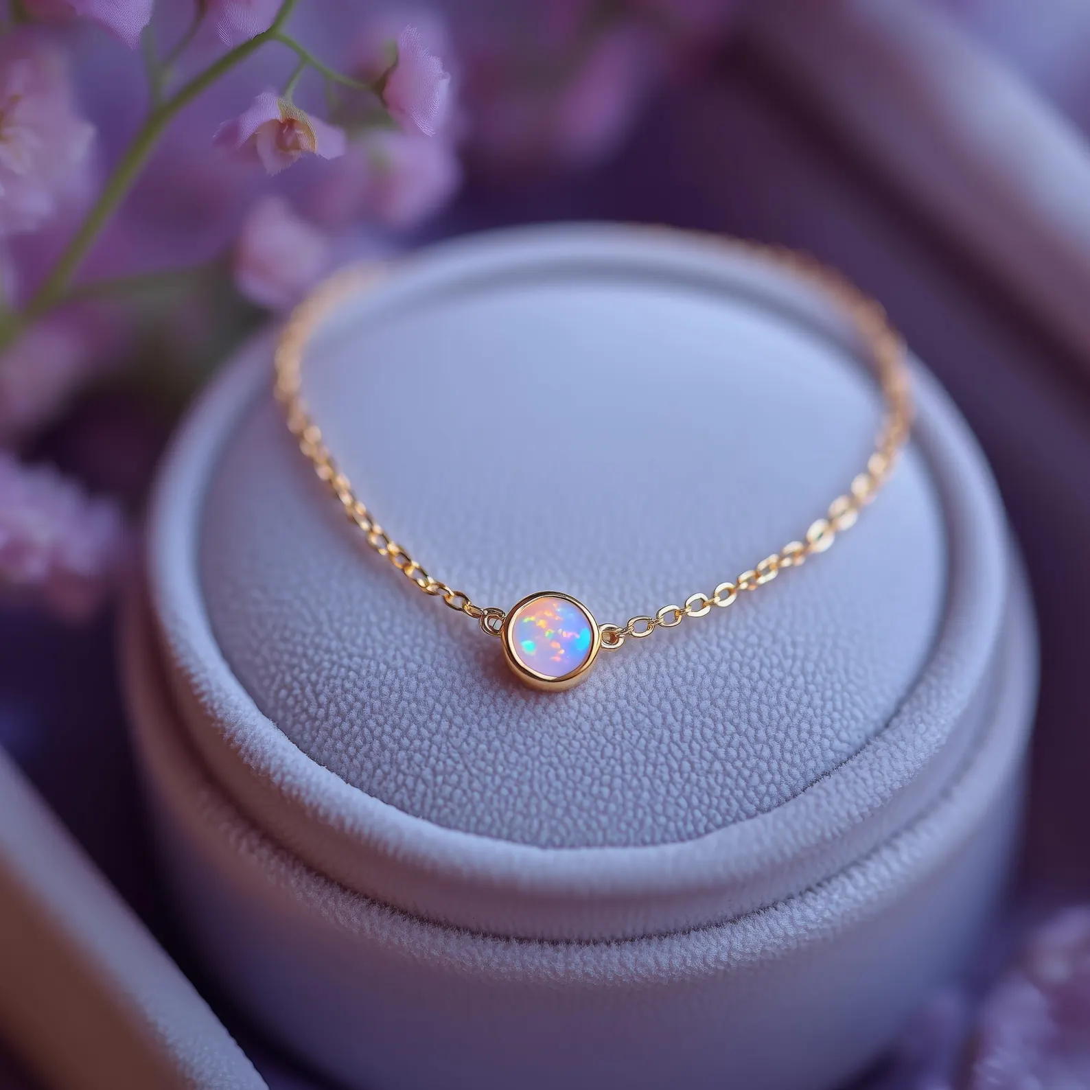 Un bracelet délicat en opale sur une chaîne fine, en acier chirurgical hypoallergénique et finition or 18 carats. Discrètement lumineux et léger, conçu pour reposer près de la peau et capter la lumière au moindre mouvement.