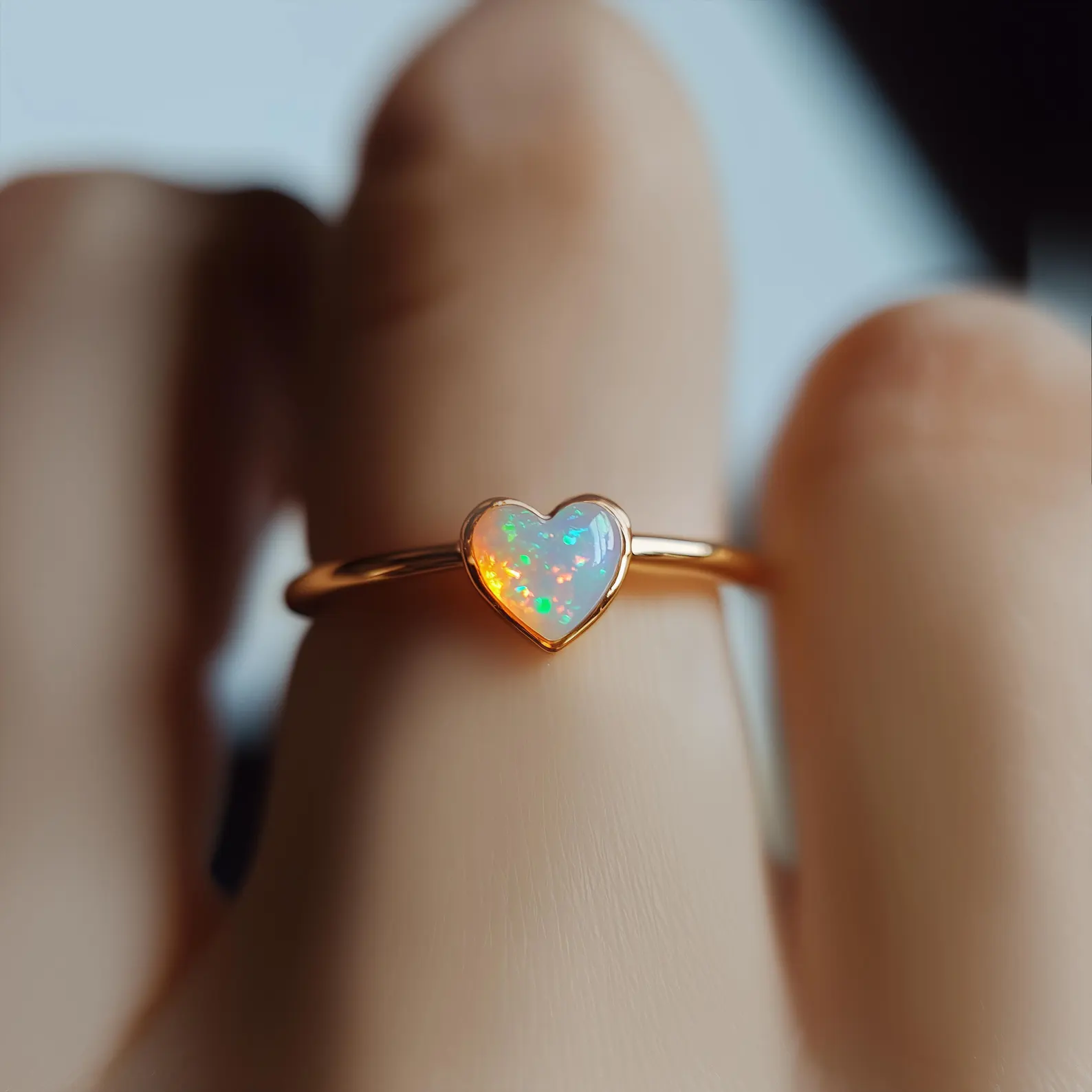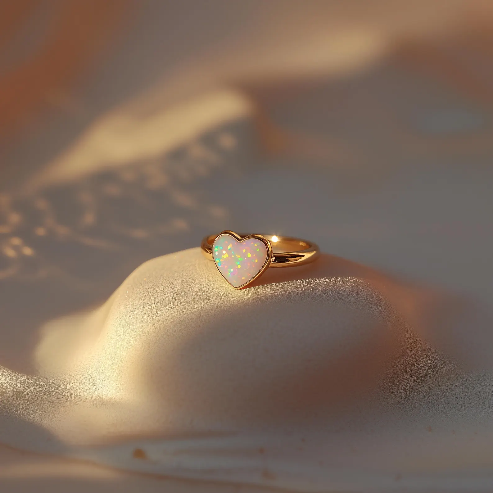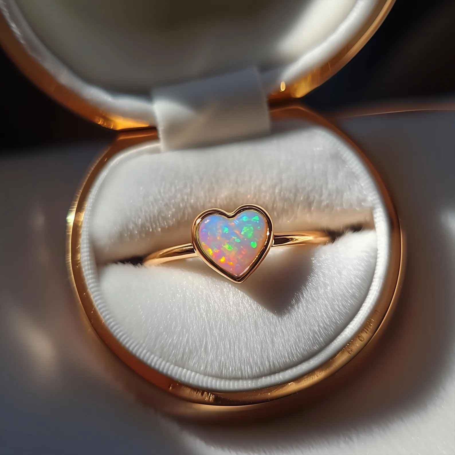 Une bague en opale en forme de cœur sur un anneau lisse et fin — finition or 18 carats. Douce, simple et discrètement rayonnante, faite pour être offerte à quelqu'un de spécial, ou comme un doux rappel de s'aimer soi-même d'abord.