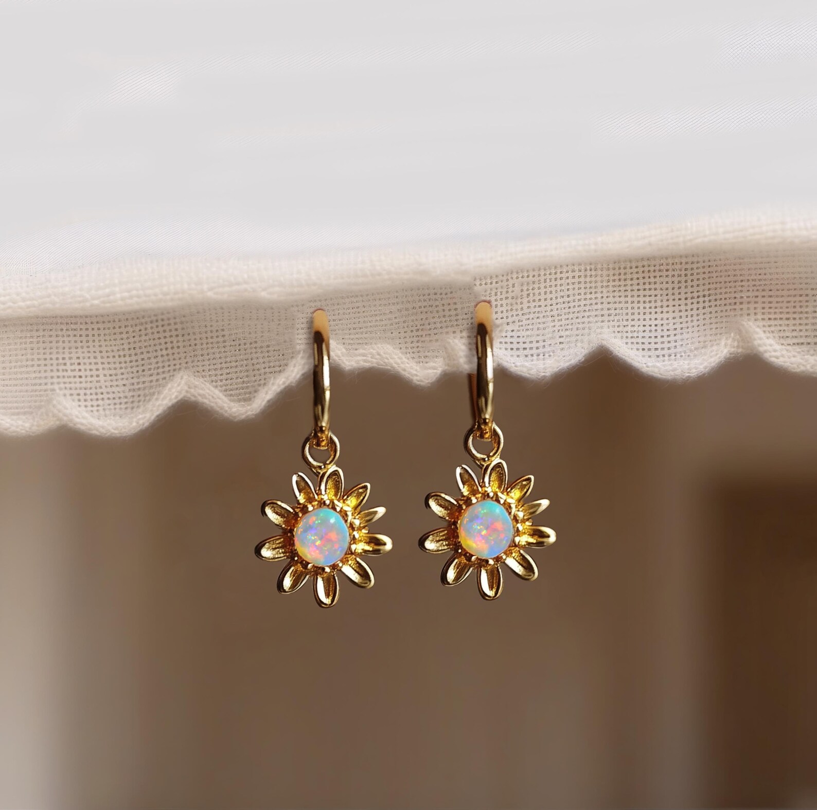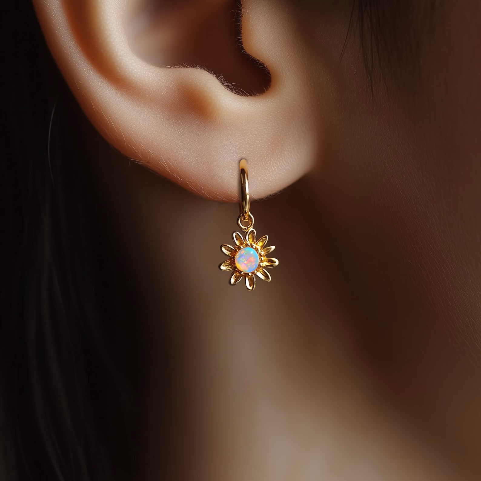 De petites mini-créoles dorées avec un pendentif tournesol en opale — finition or 18 carats, conçues pour danser à chaque mouvement. Douces, dorées et discrètement rayonnantes, comme une petite floraison qu'on emporte avec soi.