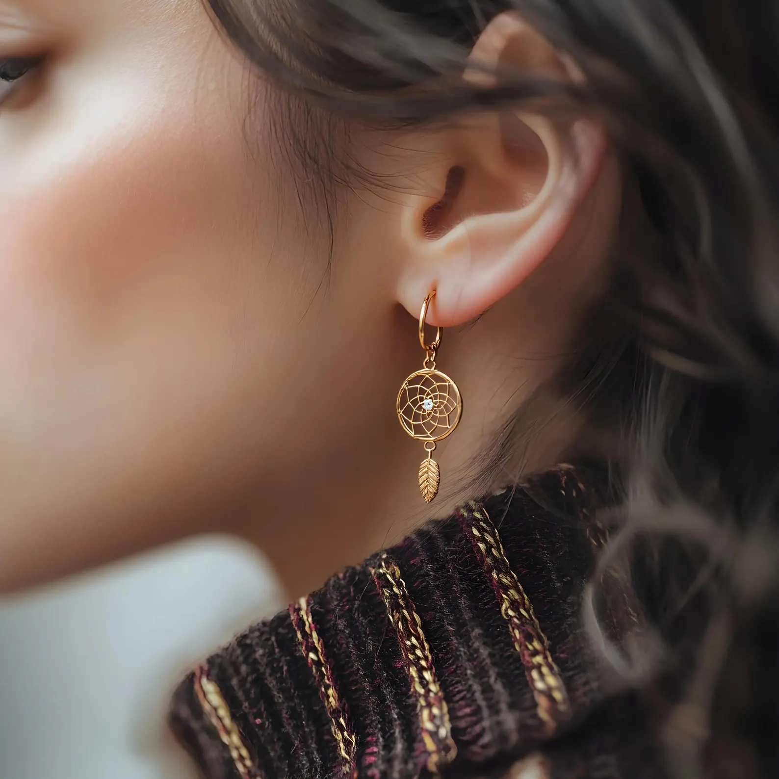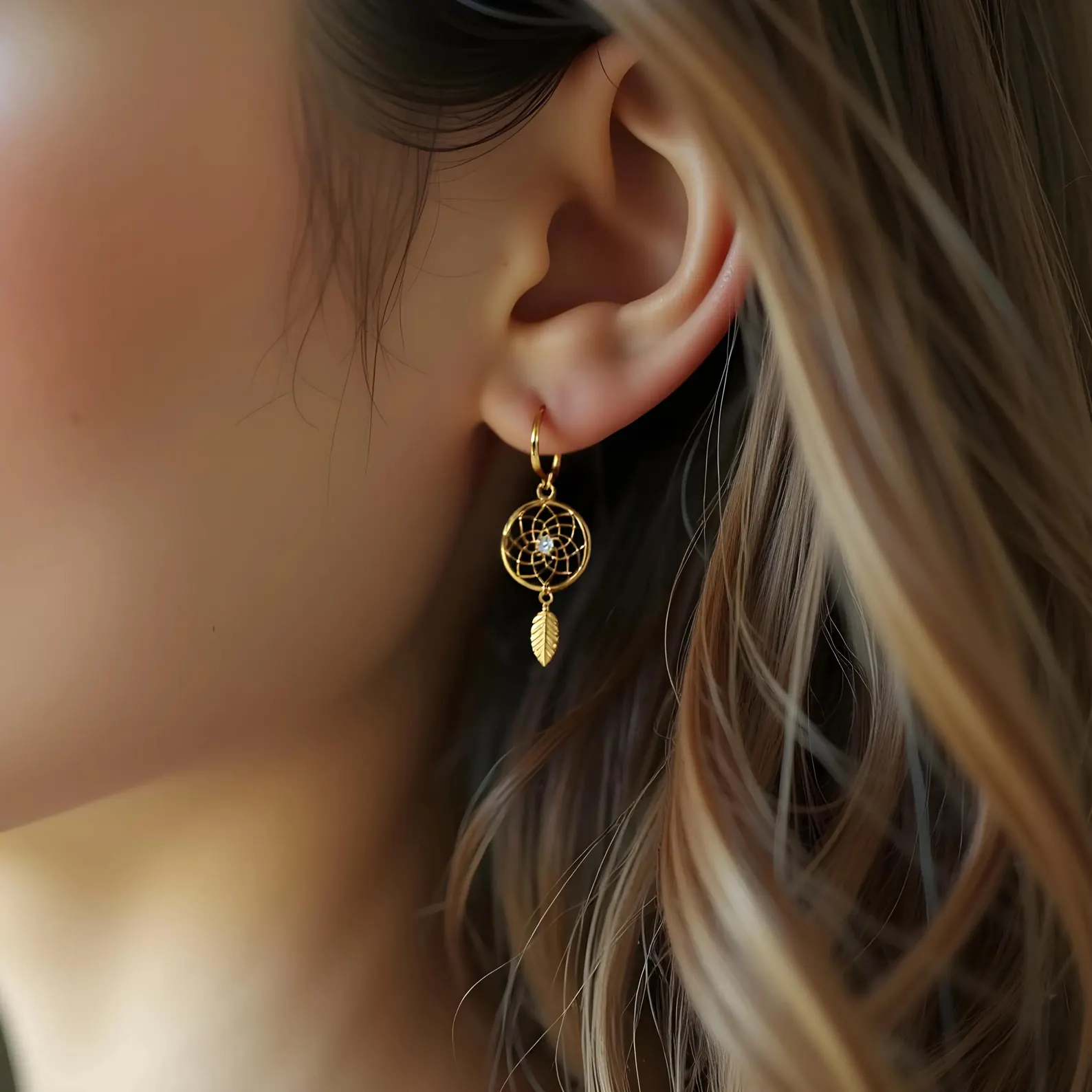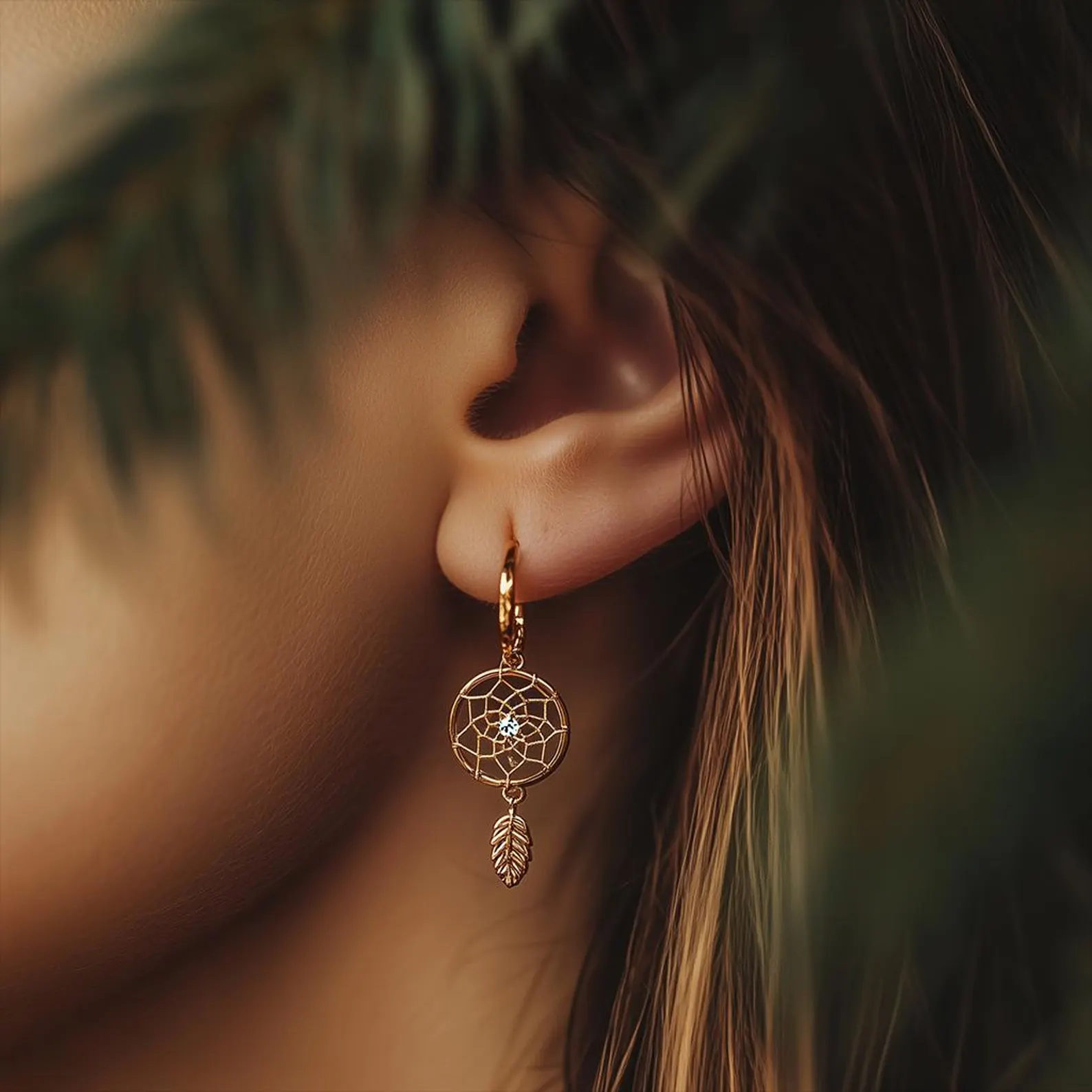 De petites pendantes attrape-rêves dorées avec une toile finement tissée, une pierre scintillante et une plume — finition or 18 carats. Discrètement poétiques, faites pour bouger avec vous au fil des heures lentes de la nuit.