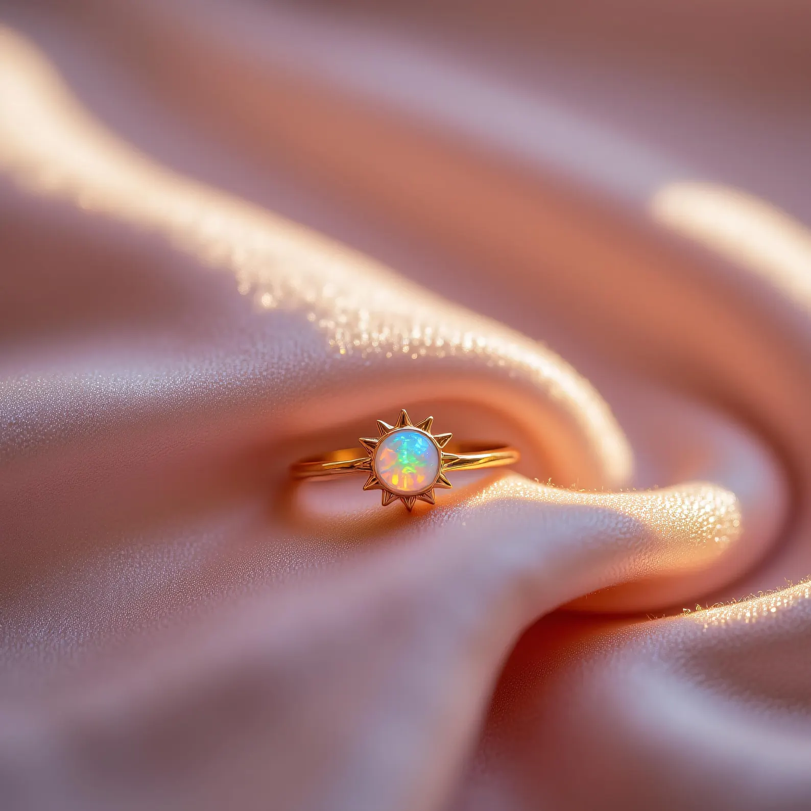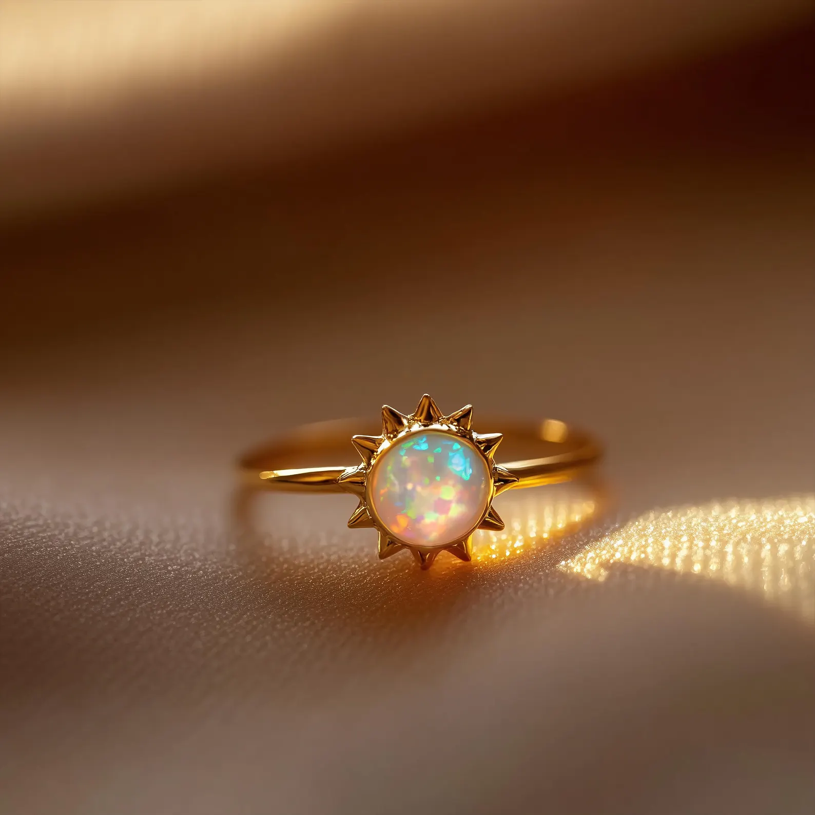 Une opale rayonnante nichée dans un soleil doré — finition or 18 carats. Audacieuse mais délicate, elle capture la chaleur des premières lueurs, conçue pour les rêveurs, les chasseurs de lumière et les amoureux du céleste.