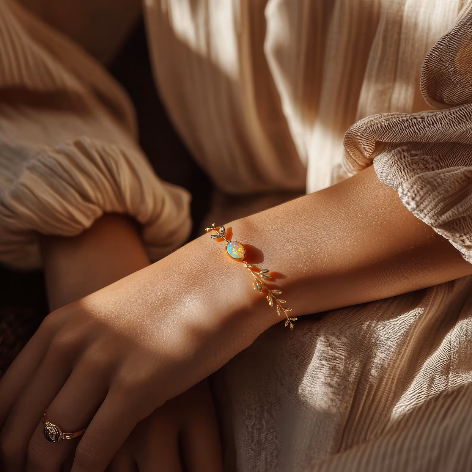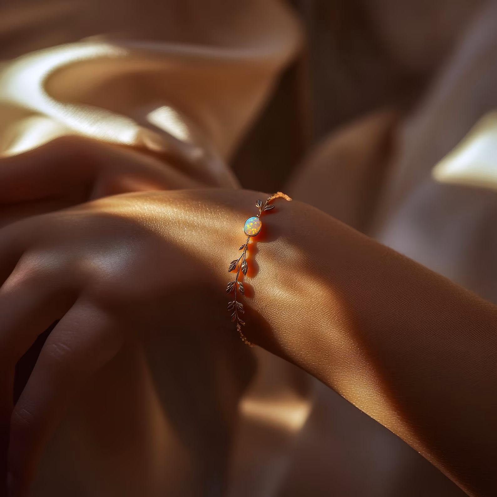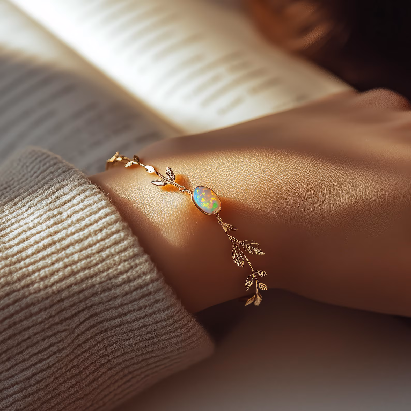 Un bracelet délicat en opale encadré de petites feuilles dorées, en acier chirurgical hypoallergénique et finition or 18 carats. Doux, organique et discrètement lumineux — un petit fragment de nature, fait pour grandir avec vous.